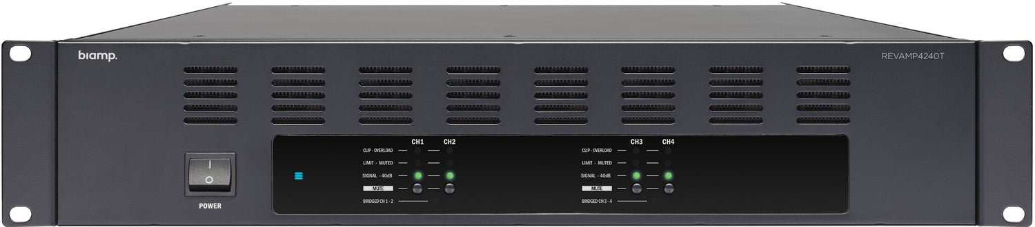 REVAMP4240T is a professional 4-channel digital power amplifier with 4 x 240-watt output power @ 100 volt, but the unit is also bridgeable to 2 x 480 watts @ 100 volt. The unit incorporates a high efficiency SMPS power supply and outputs with efficient Class D output topology.
