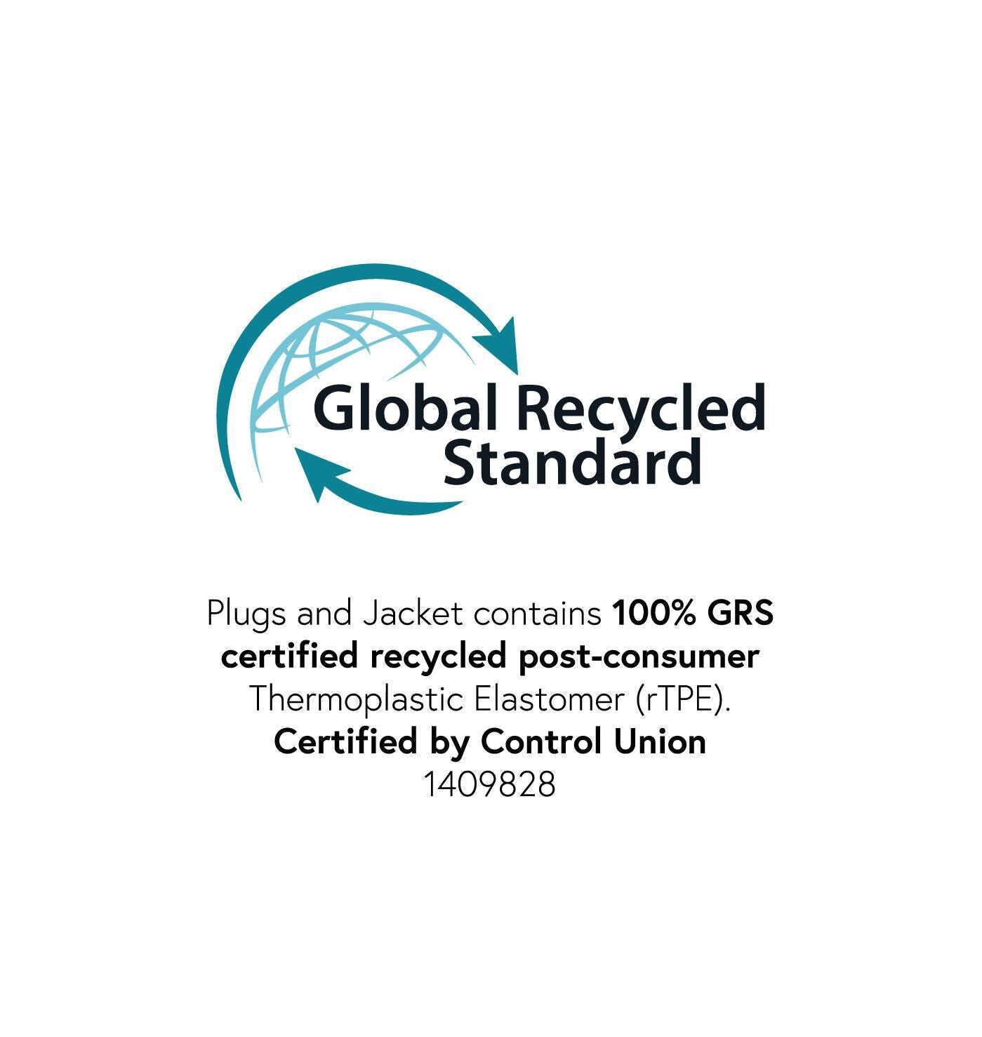 The plugs and jacket contain 100% Global Recycled Standard* certified post-consumer recycled TPE, and the conductor insulation contain 100% Global Recycled Standard* certified recycled PE, certified by Control Union 1409828.
