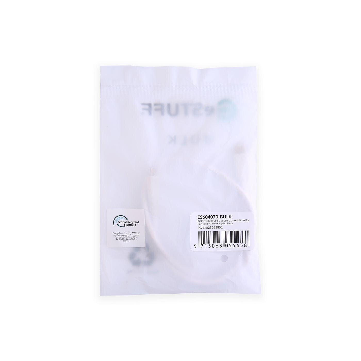 The plugs and jacket contain 100% Global Recycled Standard* certified post-consumer recycled TPE, and the conductor insulation contain 100% Global Recycled Standard* certified recycled PE, certified by Intertek 233481.